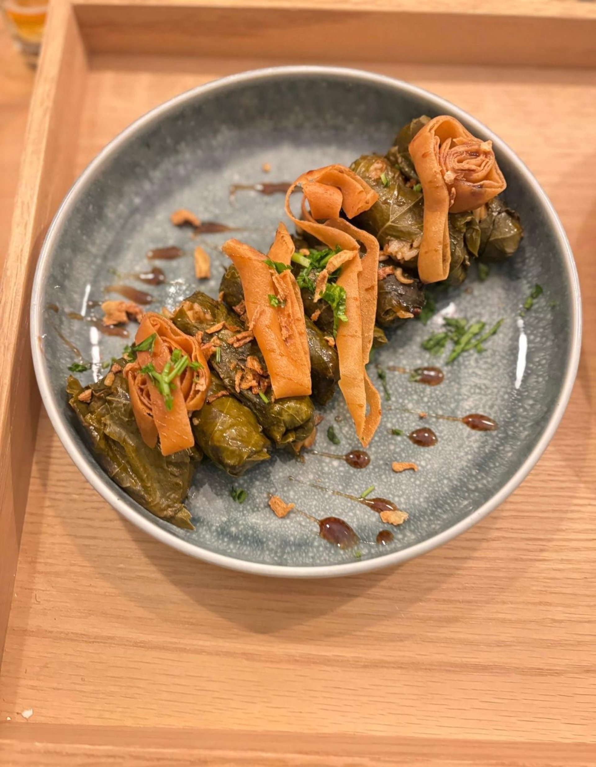 Des feuilles de vigne, des légumes farcis à la viande et au riz, accompagnés d'un mutabal crémeux et un taboulé frais.
